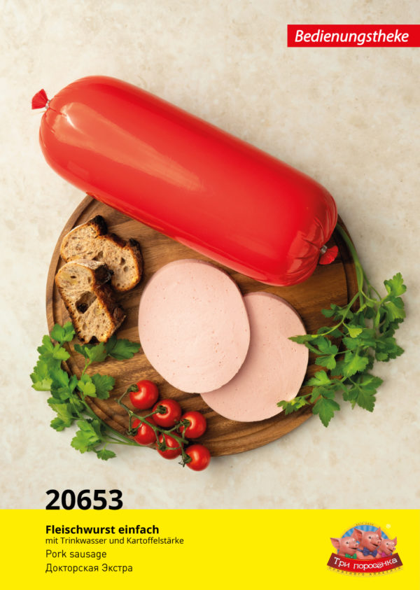 Zutaten: 52% Schweinefleisch, Speck, Trinkwasser, 4% Kartoffelstärke, Kochsalz, Knoblauch, Zwiebeln, Gewürze, Gewürzextrakte, Antioxidationsmittel (E301), Farbstoff (E120), Geschmacksverstärker (E621), Konservierungsstoff (E250), Säureregulatoren (E262,E331), Stabilisatoren (E450,E451), Verdickungsmittel (E412). Wursthülle nicht essbar.